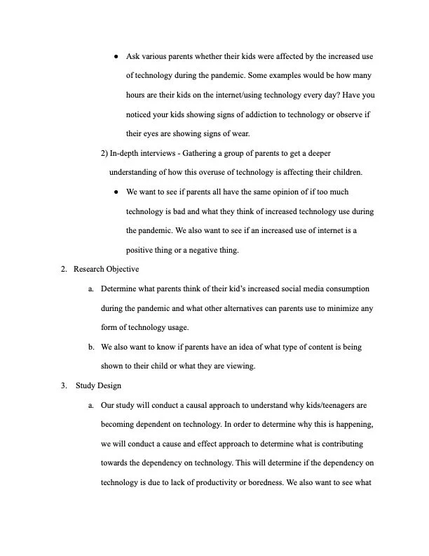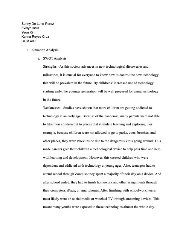 During my junior year at CSUDH my group and I created a creative brief and a SWOT analysis. The purpose of this project was to speak on society advances in new technological discoveries and milestones. It is crucial for everyone to know how to control the new technology that will be prevalent in the future. By childrens’ increased use of technology starting early, the younger generation will be well prepared for using technology in the future. We conducted a situation analysis, experience surveys, in-depth interviews, research objective, study design, and research method.