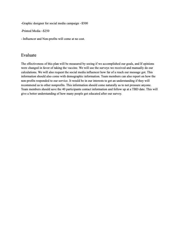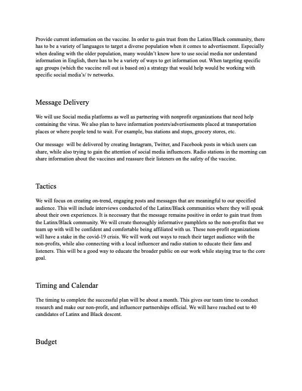 During my sophomore year at CSUDH my group and I created a public relations plan for Southwest General Hospital for my Culture, Gender, and Strategic Communications course. The purpose of this project was to target the Black and Latinx Community and Covid-19 vaccine. This is due to the mistrust from these communities in regard to the Covid-19 vaccine. We developed educational tools that provide up to date information regarding the virus as well as details on the vaccinations. We created radio ads, print ads, and a tv commercial. This was an amazing experience to create a wonderful public relations plan before we expected our campaign.